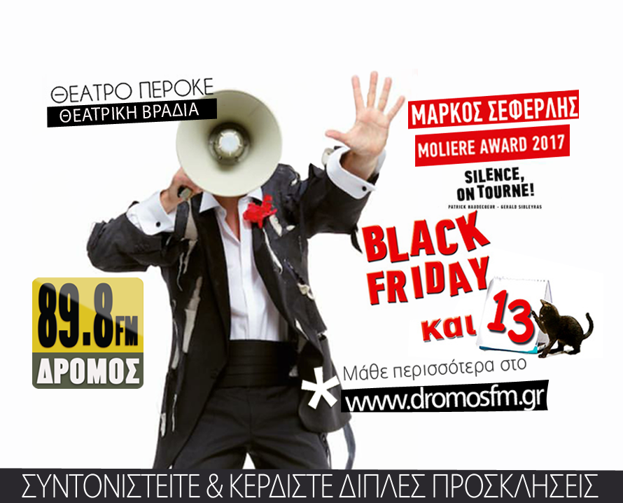 O ΔΡΟΜΟΣ 89,8 σας προσκαλεί σε μια θεατρική βραδιά με την ξεκαρδιστική κωμωδία «Black Friday και 13» με το μοναδικό Μάρκο Σεφερλή, στο θέατρο Περοκέ!