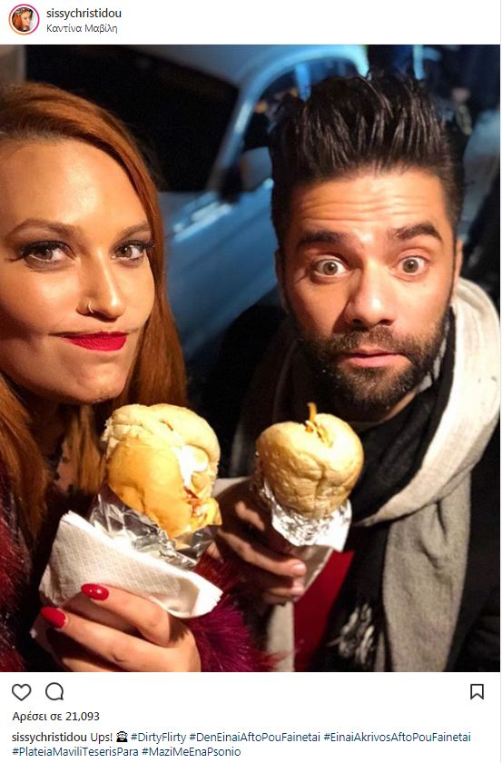 Η Σίσσυ Χρηστίδου και ο Θοδωρής Μαραντίνης απόλαυσαν ένα «βρώμικο» από την πλατεία Μαβίλη, ήτοι ένα «ενισχυμένο» σάντουιτς από αυτά για τα οποία φημίζεται το σημείο αυτό της Αθήνας. Το αγαπημένο ζευγάρι πόζαρε με τα σάντουιτς ανά χείρας και η Σίσσυ ανέβασε τη φωτογραφία στο Instagram.Μάλιστα στη λεζάντα έκανε πλάκα με το γνωστό τραγούδι του Γιώργου Δημητριάδη «Σ΄ ένιωσα μέσα μου παντού» χρησιμοποιώντας στίχους όπως: «μαζί με ένα ψώνιο» κτλ.