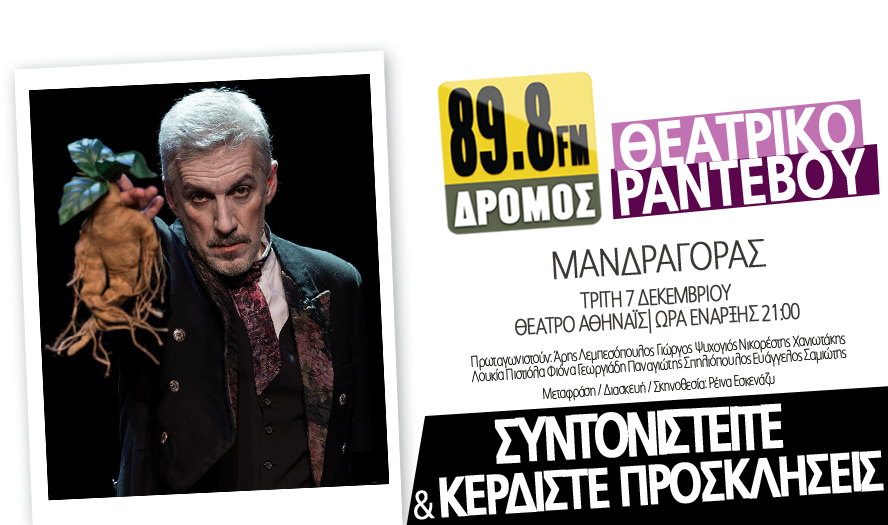 O ΔΡΟΜΟΣ 89,8 σας δίνει θεατρικό ραντεβού στην παράσταση «ΜΑΝΔΡΑΓΟΡΑΣ» στο θεατρο ΑΘΗΝΑΪΣ, την ΤΡΙΤΗ 7 Δεκεμβρίου, στις 21:00 το βράδυ.