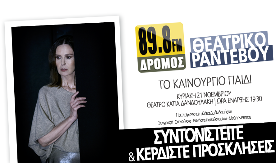 O ΔΡΟΜΟΣ 89,8 σας δίνει θεατρικό ραντεβού στην παράσταση «ΤΟ ΚΑΙΝΟΥΡΓΙΟ ΠΑΙΔΙ,» στο θέατρο ΚΑΤΙΑ ΔΑΝΔΟΥΛΑΚΗ, την Κυριακή 21 Νοεμβρίου, στις 19:30 το απόγευμα.