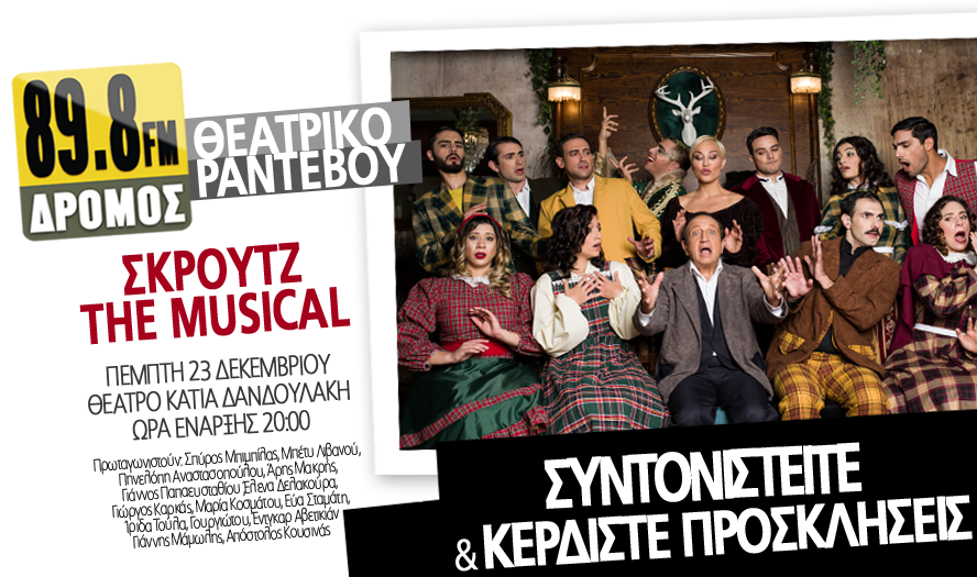 Ο ΔΡΟΜΟΣ 89,8 σας δίνει θεατρικό ραντεβού στo Χριστουγεννιάτικο musical «ΣΚΡΟΥΤΖ», την Πέμπτη 23 Δεκεμβρίου στις 20:00 το βράδυ, στο Θέατρο Κάτια Δανδουλάκη!