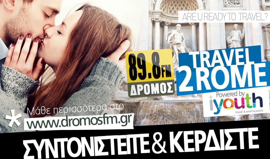 O ΔΡΟΜΟΣ 89,8 και το IYOUTH σε στέλνουν αυτή την εβδομάδα στη ΡΩΜΗ. Στείλτε τώρα μήνυμα στο 54301 γράφοντας ΔΡΟΜΟΣ TAΞΙΔΙ και το ΟΝΟΜΑΤΕΠΩΝΥΜΟ σας και διεκδικείστε ένα μοναδικό τετραήμερο με αναχώρηση από 15/01 και για όποια ημερομηνία σε βολεύει μέχρι και 20/02, για να απολαύσεις τις ατελείωτες βόλτες στην Fontana Di Trevi, σε έναν από τους πιο διάσημους προορισμούς σε ολόκληρο τον κόσμο. Το πακέτο περιλαμβάνει αεροπορικά εισιτήρια aller-retour (συμπεριλαμβανομένων φόρων ) και διαμονή 3 διανυκτερεύσεων με πρωινό! Η κλήρωση θα πραγματοποιηθεί την Παρασκευή 07 Δεκεμβρίου στο Morning Show με το Βασίλη και τη Μαίρη.