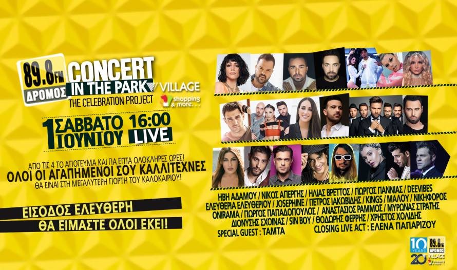 Ο ΔΡΟΜΟΣ 89,8 διοργανώνει μια συναυλία που θα αποτελέσει έναν ανεπανάληπτο μαραθώνιο μουσικής και διασκέδασης, με τα πιο hot ονόματα της ελληνικής μουσικής, να ερμηνεύουν live τις μεγαλύτερες επιτυχίες τους και να χαρίζουν μοναδικές στιγμές σε όλους όσοι θα παραβρεθούν και θα απολαύσουν το μεγαλύτερο μουσικό γεγονός της Αθήνας για το φετινό καλοκαίρι, γιορτάζοντας τα 10 χρόνια ΔΡΟΜΟΣ 89,8 και τα 20 χρόνια VILLAGE shopping and more…!