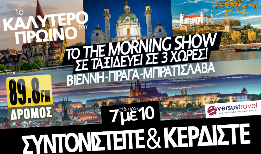 Ο ΔΡΟΜΟΣ 89.8 σας ταξιδεύει και αυτό το καλοκαίρι! Τι καλύτερο από 1 ταξίδι στο εξωτερικό την καλύτερη εποχή του χρόνου; 3 ταξίδια σε 1 στο εξωτερικό την καλύτερη εποχή του χρόνου! Γι αυτό ο ΔΡΟΜΟΣ 89.8 σας στέλνει, όχι σε μία, αλλά σε 3 παραμυθένιες πρωτεύουσες, Πράγα – Βιέννη – Μπρατισλάβα, με όλα τα έξοδα πληρωμένα!