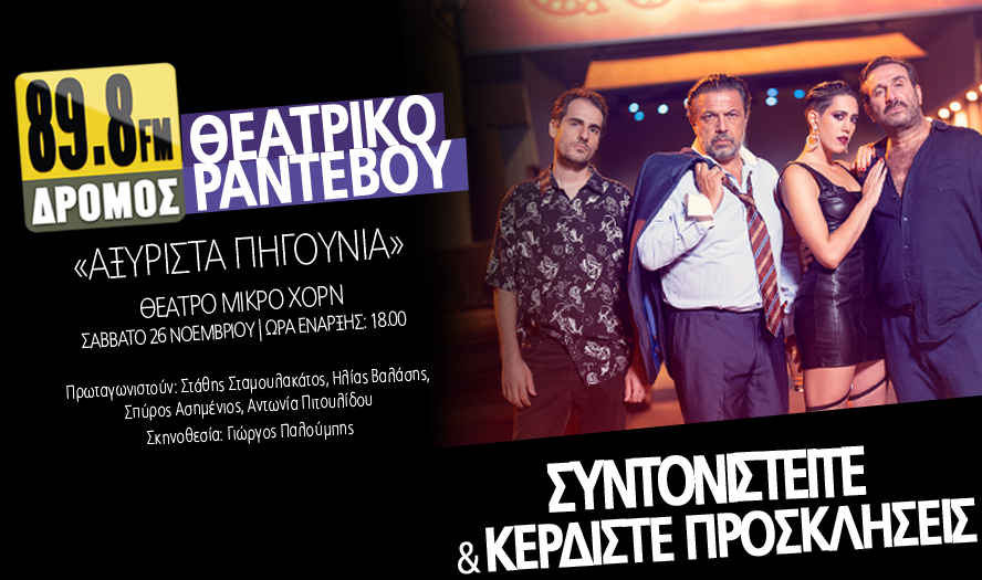 Ο ΔΡΟΜΟΣ 89,8 σας δίνει θεατρικό ραντεβού στην παράσταση «ΑΞΥΡΙΣΤΑ ΠΗΓΟΥΝΙΑ» στο Θέατρο Μικρό Χορντο Σάββατο 26 Νοεμβρίου στις 6 το απόγευμα.