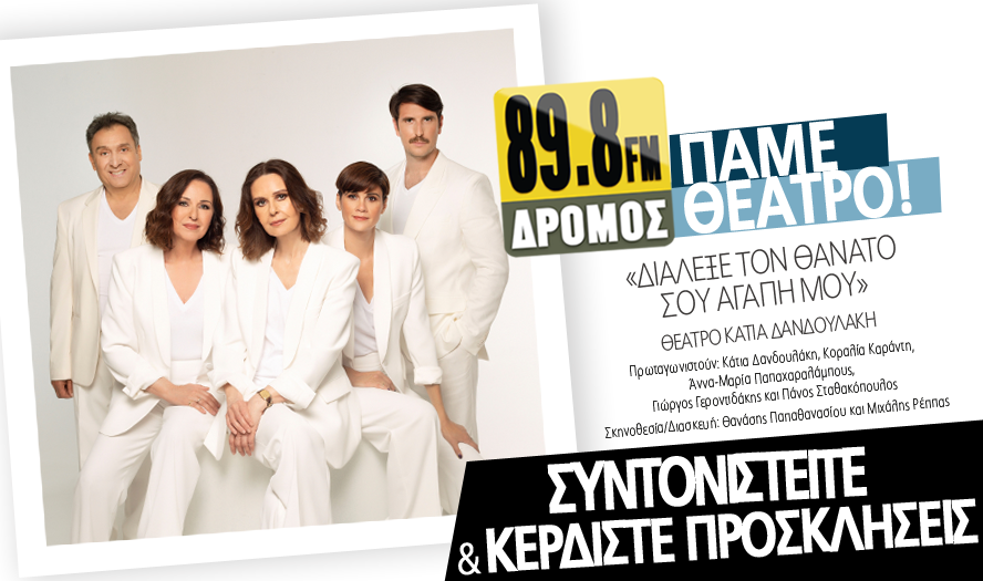 Ο ΔΡΟΜΟΣ 89,8 παρουσιάζει την παράσταση «ΔΙΑΛΕΞΕ ΤΟΝ ΘΑΝΑΤΟ ΣΟΥ ΑΓΑΠΗ ΜΟΥ» στο Θέατρο Κάτια Δανδουλάκη με πρωταγωνιστές την Κάτια Δανδουλάκη, την Κοραλία Καράντη, την Άννα-Μαρία Παπαχαραλάμπους, τον Γιώργο Γεροντιδάκη και τον Πάνο Σταθακόπουλο, σε σκηνοθεσία και διασκευή των Θανάση Παπαθανασίου και Μιχάλη Ρέππα.