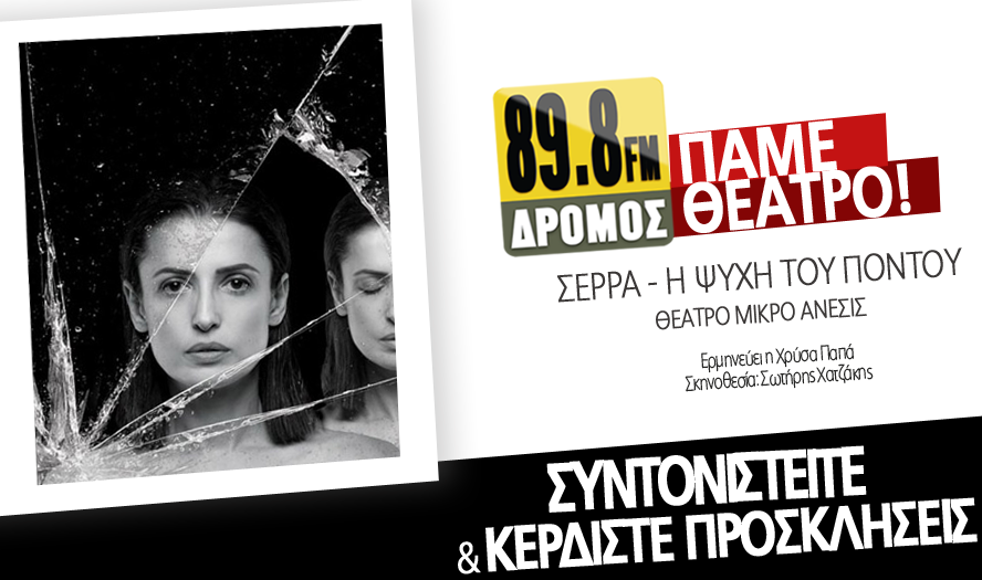 O ΔΡΟΜΟΣ 89,8 σας δίνει την ευκαιρία να απολαύσετε την παράσταση «ΣΕΡΡΑ – Η ΨΥΧΗ ΤΟΥ ΠΟΝΤΟΥ» με τη Χρύσα Παπά στο Θέατρο Μικρό Άνεσις το Σάββατο 15 Οκτωβρίου στις 9:00 το βράδυ.