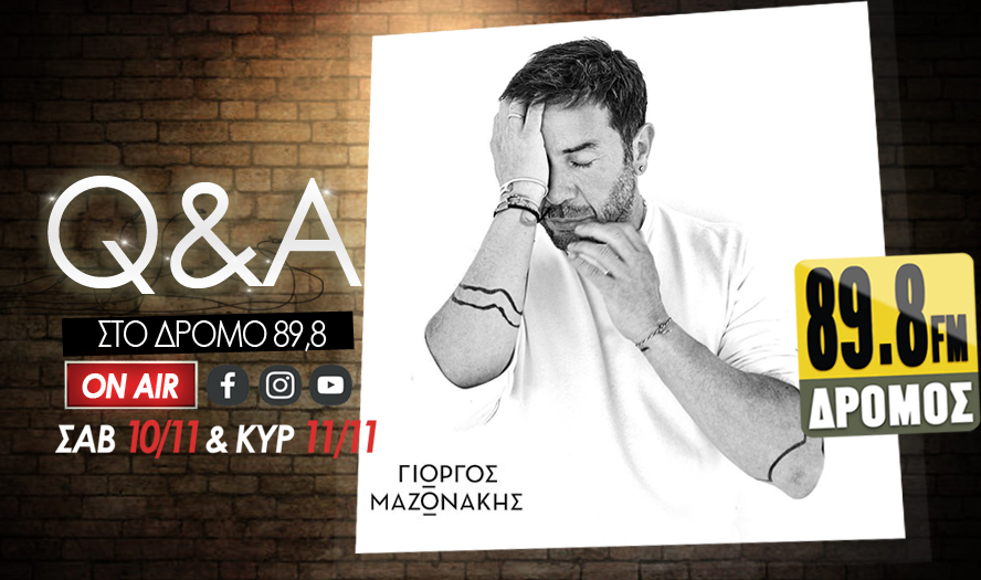 Συντονιστείτε το Σάββατο 10 και την Κυριακή 11 Νοεμβρίου στο ραδιόφωνο, στο Facebook, στο Instagram και το Youtube του ΔΡΟΜΟΥ 89,8 και απολαύστε πρώτοι και αποκλειστικά ένα μοναδικό Q&A με το Γιώργο Μαζωνάκη!